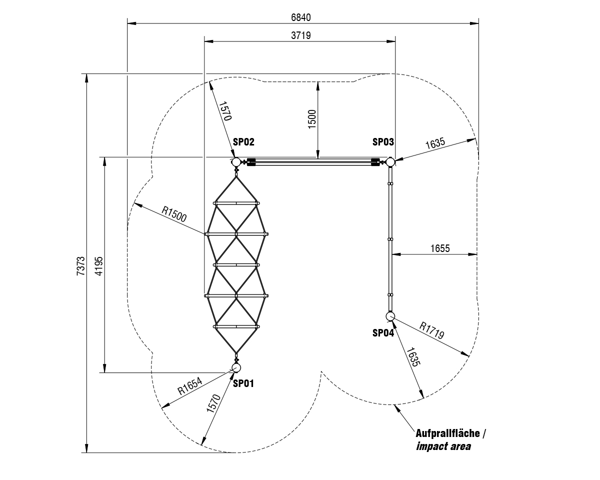 Die Pfostenhöhe über der Spielebene beträgt 2070 mm und die Gesamtlänge 3070 mm.
