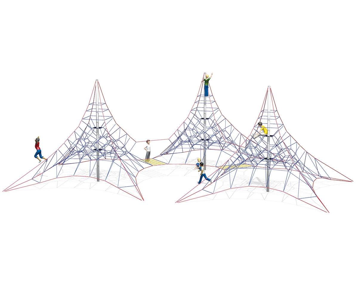 Achtfach abgespannt beeindruckt diese Anlage durch ihr großes Spielvolumen. Die Flächennetze zwischen den einzelnen Geräten sind auswechselbar und in verschiedenen Farben erhältlich.